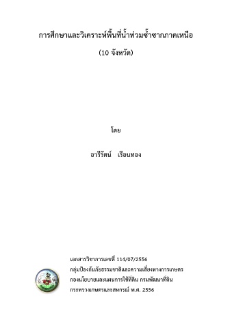 การศึกษาและวิเคราะห์พื้นที่น้้าท่วมซ้้าซากภาคเหนือ (10 จังหวัด) โดย อารีรัตน์ เรือนทอง เอกสารวิชาการเลขที่ 114/07/2556 กลุ่มป้องกันภัยธรรมชาติและความเสี่ยงทางการเกษตร กองนโยบายและแผนการใช้ที่ดิน กรมพัฒนาที่ดิน กระทรวงเกษตรและสหกรณ์ พ.ศ. 2556