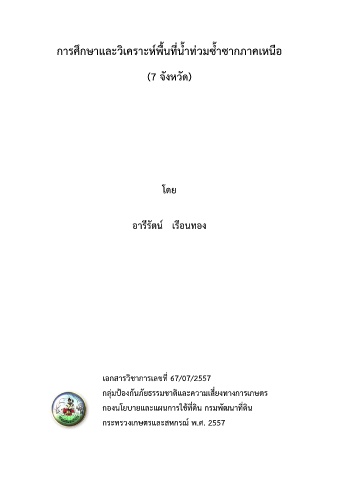 การศึกษาและวิเคราะห์พื้นที่น้้าท่วมซ้้าซากภาคเหนือ (7 จังหวัด) โดย อารีรัตน์ เรือนทอง เอกสารวิชาการเลขที่ 67/07/2557 กลุ่มป้องกันภัยธรรมชาติและความเสี่ยงทางการเกษตร กองนโยบายและแผนการใช้ที่ดิน กรมพัฒนาที่ดิน กระทรวงเกษตรและสหกรณ์ พ.ศ. 2557