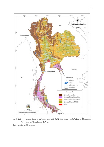 14 ภาพที่ 2.3 กลุมชุดดินแบงตามลักษณะและสมบัติดินที่มีศักยภาพคลายคลึงกันในดานที่มีผลตอการ เจริญเติบโต และใหผลผลิตของพืชที่ปลูก ที่มา : กรมพัฒนาที่ดิน (2556)