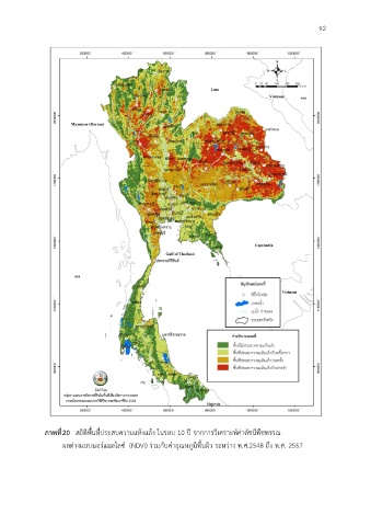 92 ภาพที่ 20 สถิติพื้นที่ประสบความแห้งแล้ง ในรอบ 10 ปี จากการวิเคราะห์ค่าดัชนีพืชพรรณ ผลต่างแบบนอร์แมลไลซ์ (NDVI) ร่วมกับค่าอุณหภูมิพื้นผิว ระหว่าง พ.ศ.2548 ถึง พ.ศ. 2557