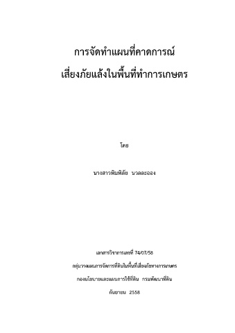 การจัดทําแผนที่คาดการณ เสี่ยงภัยแลงในพื้นที่ทําการเกษตร โดย นางสาวพิมพิลัย นวลละออง เอกสารวิชาการเลขที่ 74/07/58 กลุมวางแผนการจัดการที่ดินในพื้นที่เสี่ยงภัยทางการเกษตร กองนโยบายและแผนการใชที่ดิน กรมพัฒนาที่ดิน กันยายน 2558