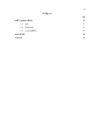 (2) สารบัญ (ต่อ) หน้า บทที่ 5 สรุปผลการศึกษา 55 5.1 สรุป 55 5.2 ข้อเสนอแนะ 56 5.3 ประโยชน์ที่ได้รับ 57 เอกสารอ้างอิง 58 ภาคผนวก 61