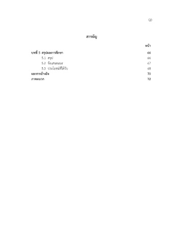 (2) สารบัญ หน้า บทที่ 5 สรุปผลการศึกษา 66 5.1 สรุป 66 5.2 ข้อเสนอแนะ 67 5.3 ประโยชน์ที่ได้รับ 68 เอกสารอ้างอิง 70 ภาคผนวก 72