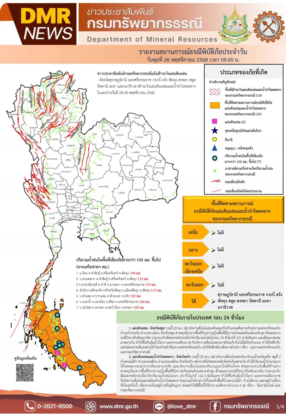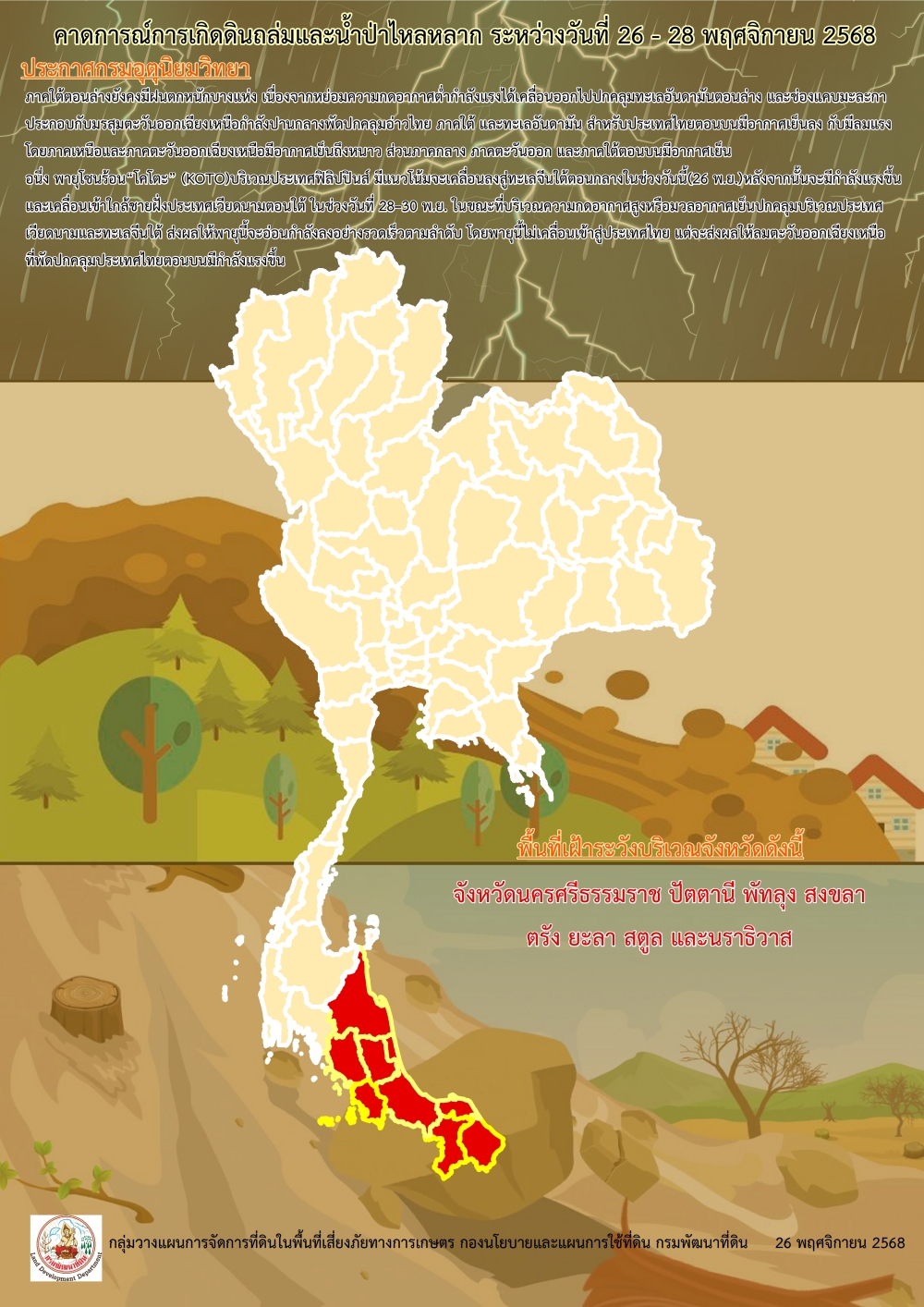 คาดการณ์การเกิดดินถล่ม และน้ำป่าไหลหลาก ระหว่างวันที่ 26 - 28 พฤศจิกายน 2568 |